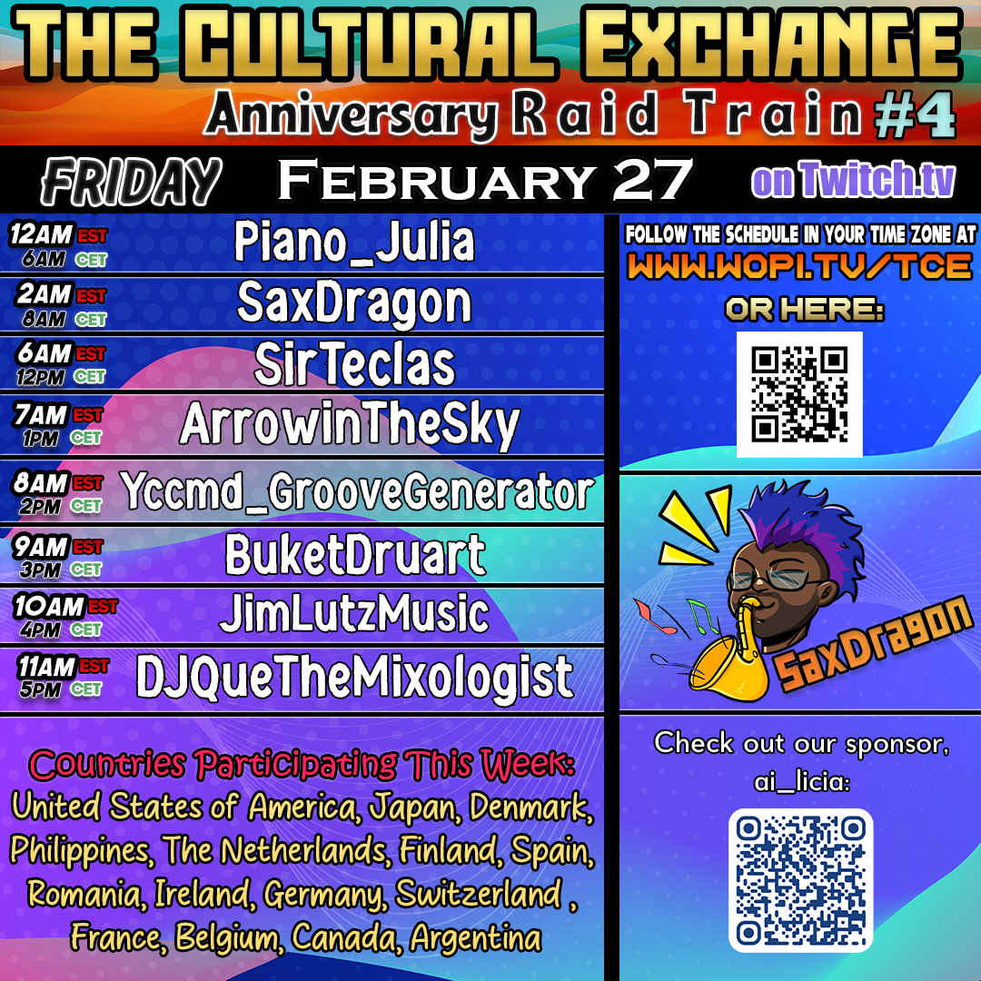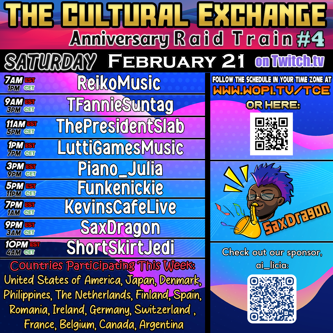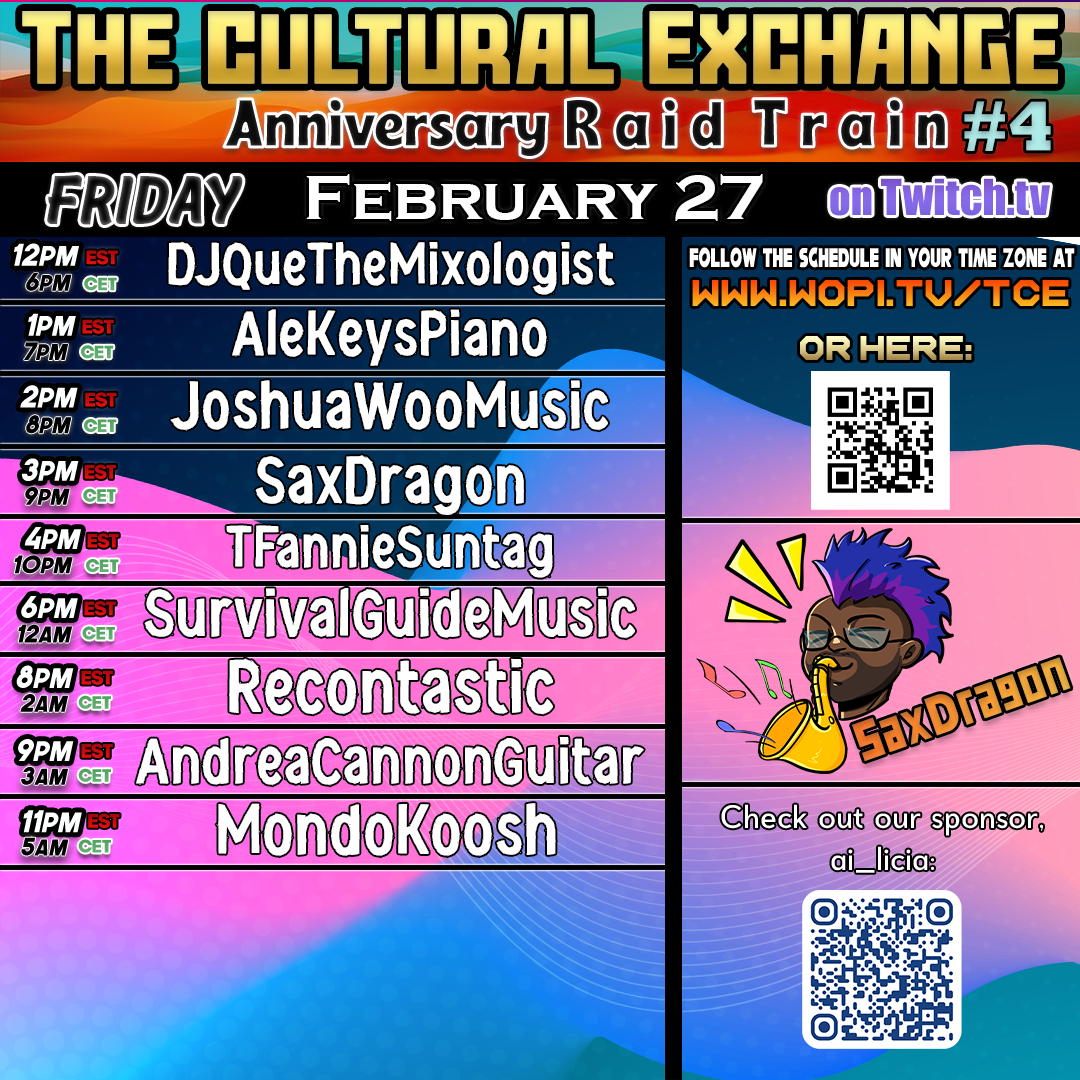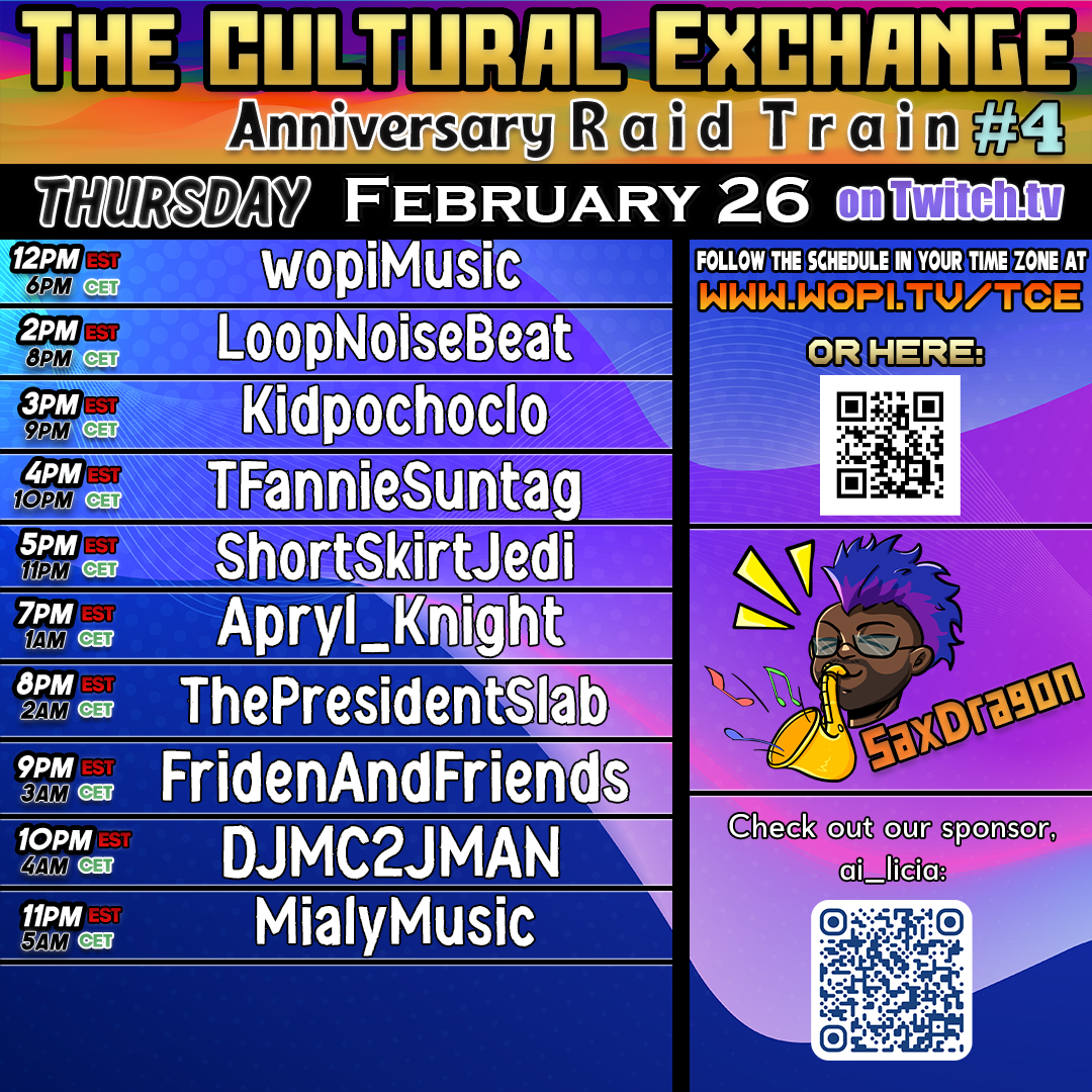 The Cultural Exchange is a raid train started by SaxDragon because he found out, that the music community somehow is mostly collaborating locally in their own genre/geographic area and decided, this needs to change. This is why The Cultural Exchange is here, where music streamers from all over the world - no matter if they are producers, creating originals or covers or djs - work together and form a huge music event over a full weekend, so we can meet each other and also our viewers can meet amazing artists from all over the world.