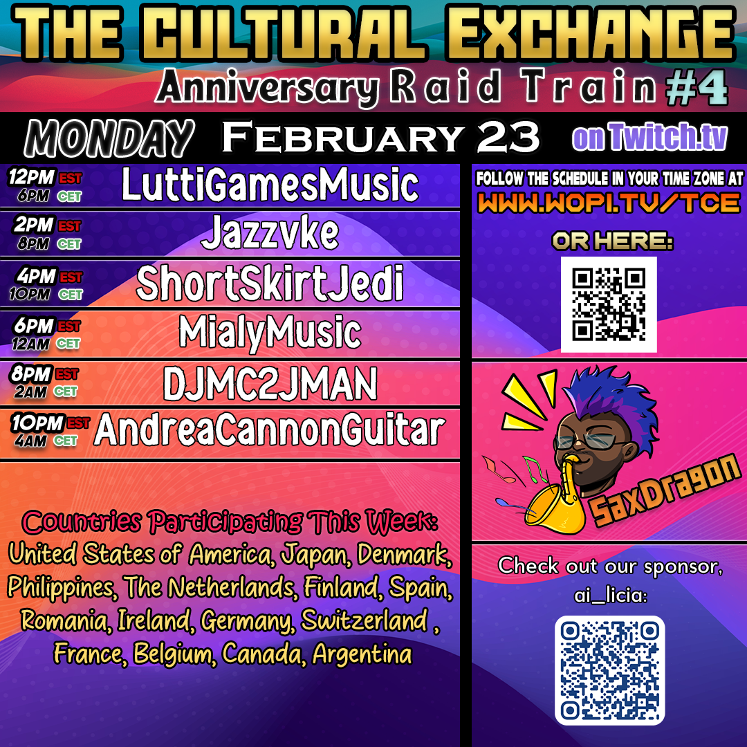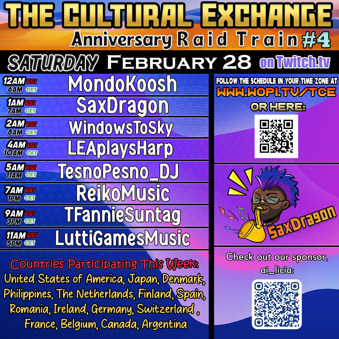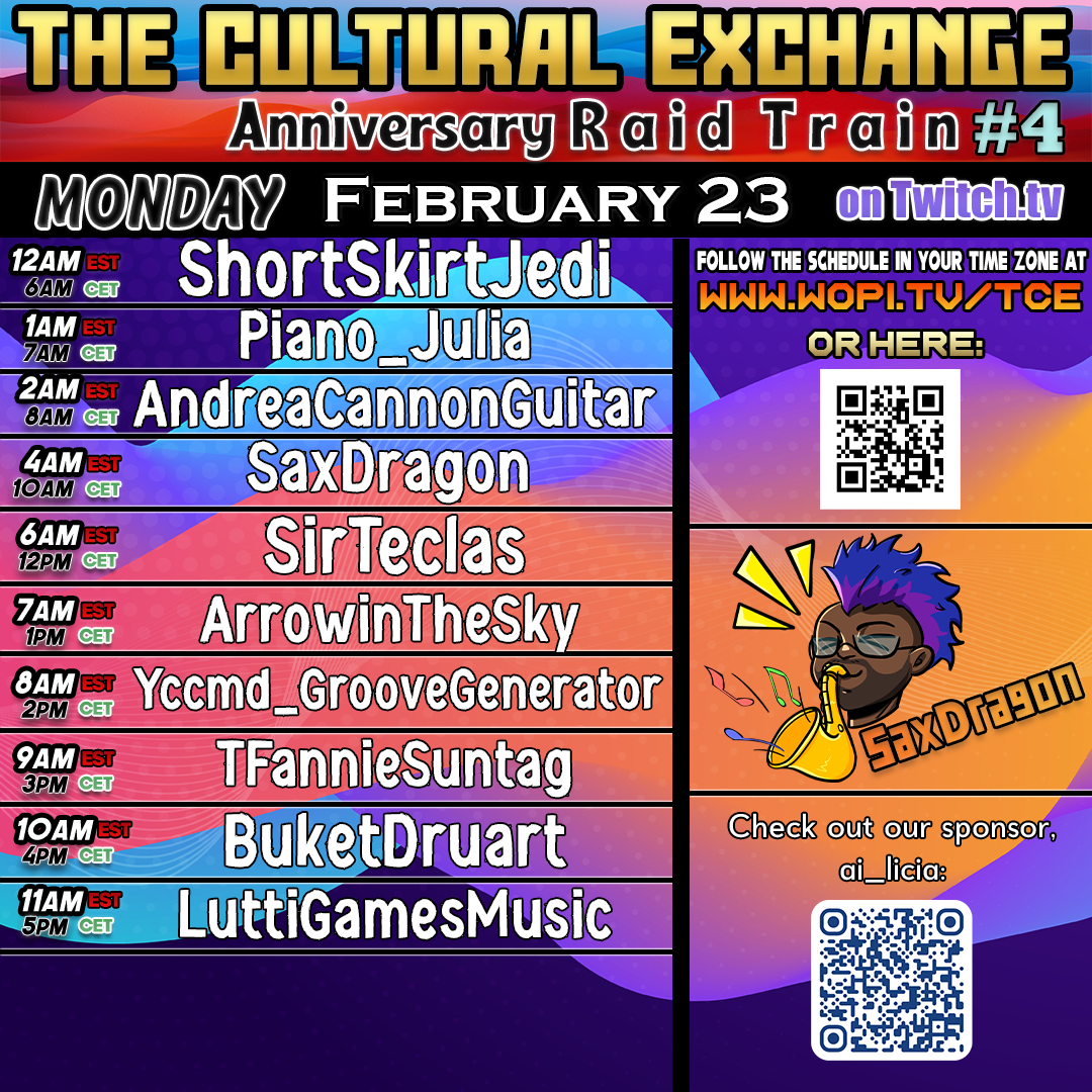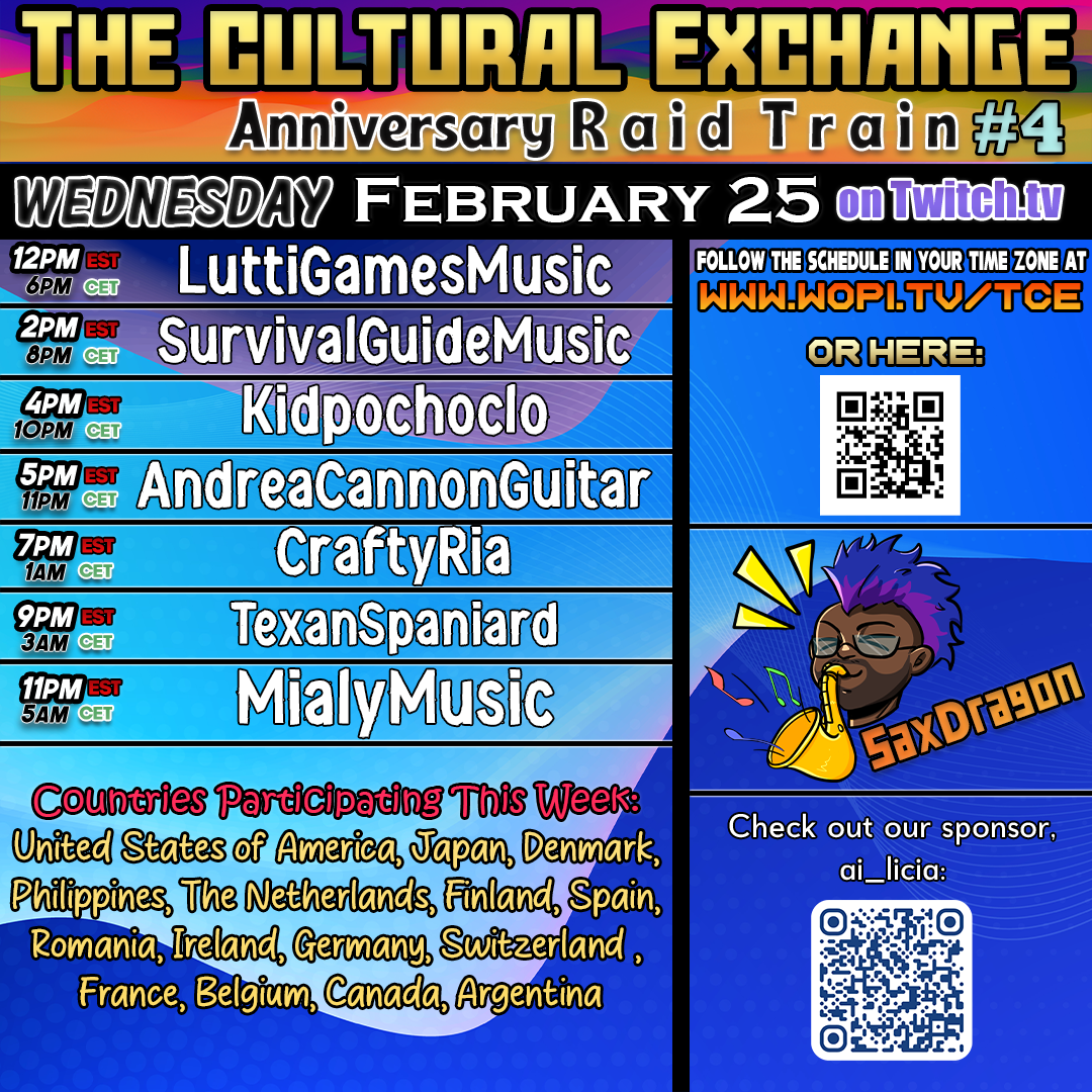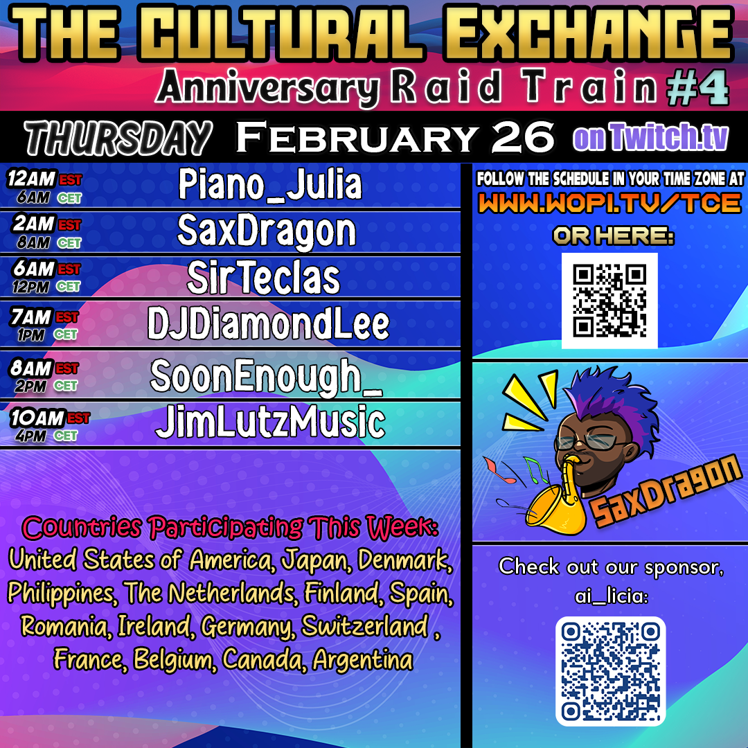 The Cultural Exchange is a raid train started by SaxDragon because he found out, that the music community somehow is mostly collaborating locally in their own genre/geographic area and decided, this needs to change. This is why The Cultural Exchange is here, where music streamers from all over the world - no matter if they are producers, creating originals or covers or djs - work together and form a huge music event over a full weekend, so we can meet each other and also our viewers can meet amazing artists from all over the world.