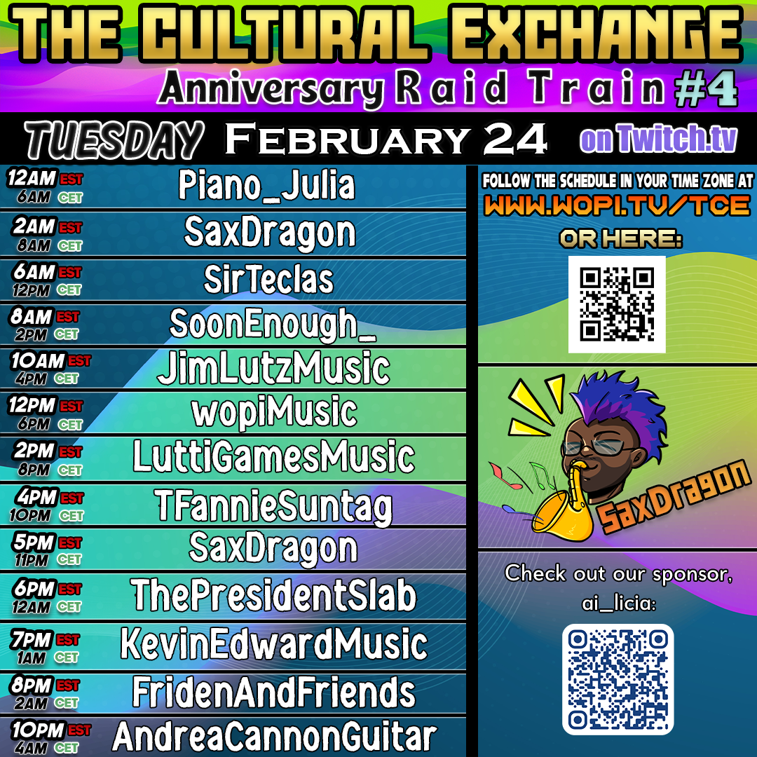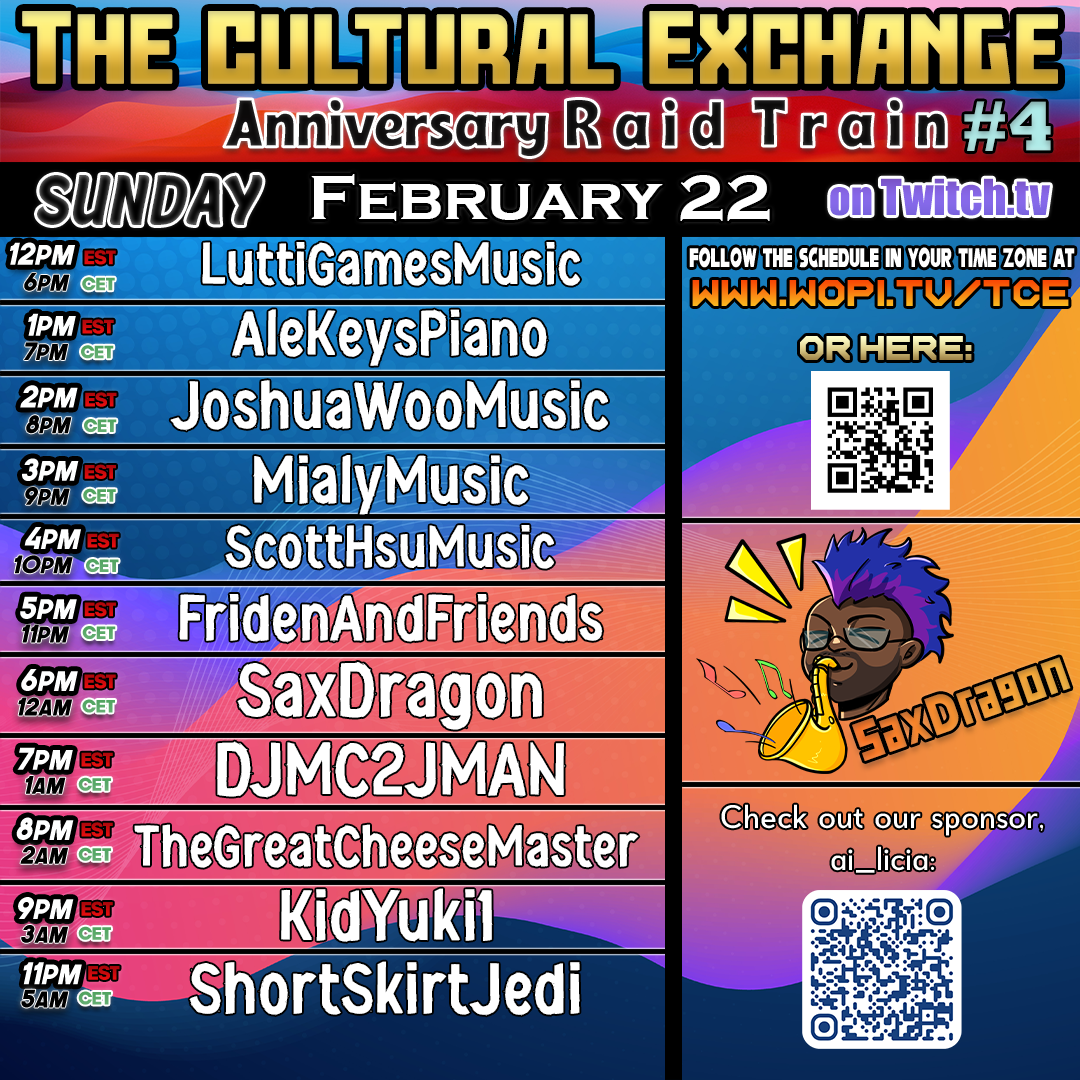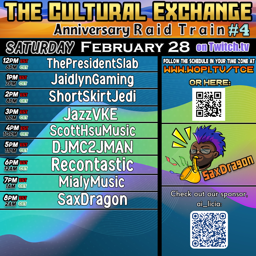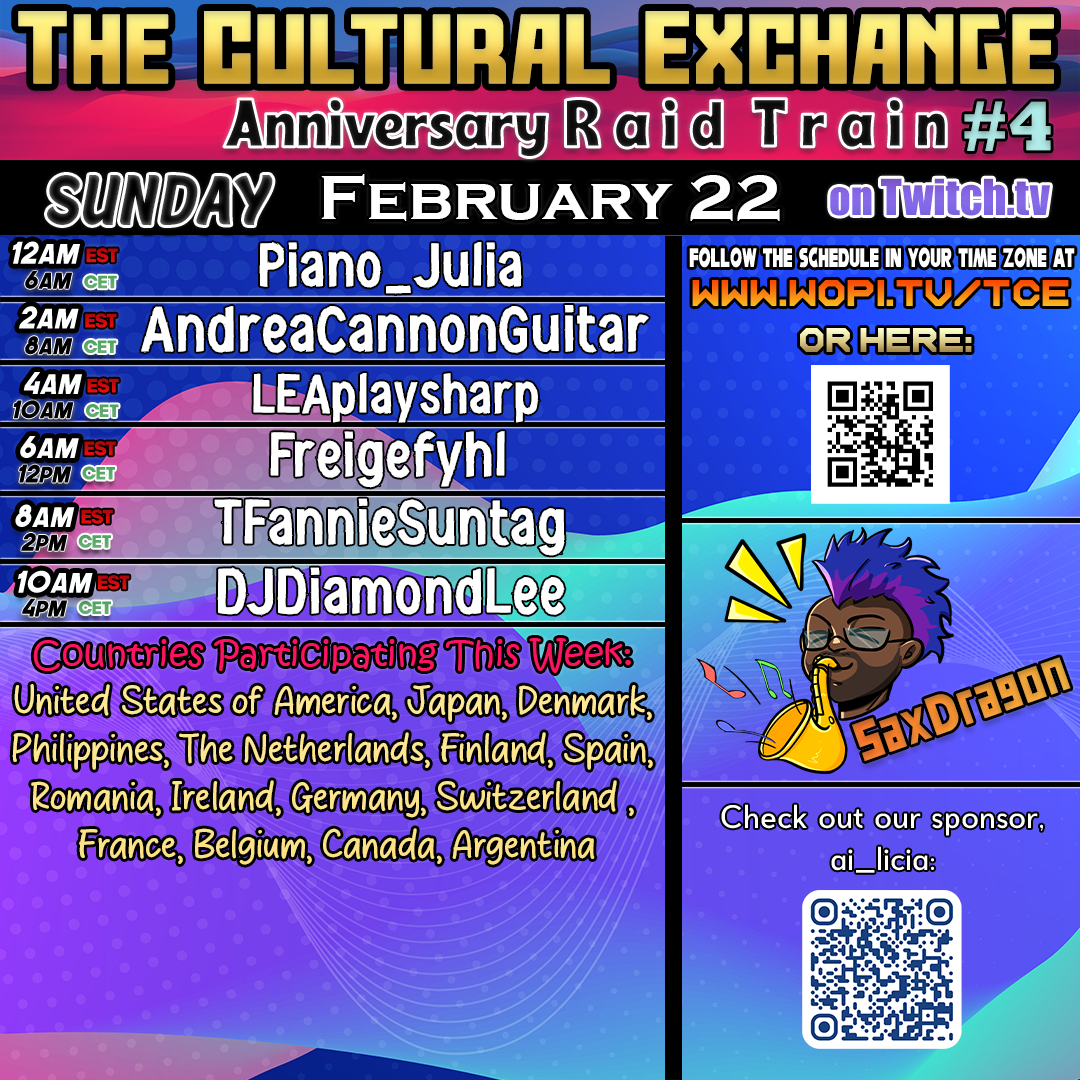The Cultural Exchange is a raid train started by SaxDragon because he found out, that the music community somehow is mostly collaborating locally in their own genre/geographic area and decided, this needs to change. This is why The Cultural Exchange is here, where music streamers from all over the world - no matter if they are producers, creating originals or covers or djs - work together and form a huge music event over a full weekend, so we can meet each other and also our viewers can meet amazing artists from all over the world.